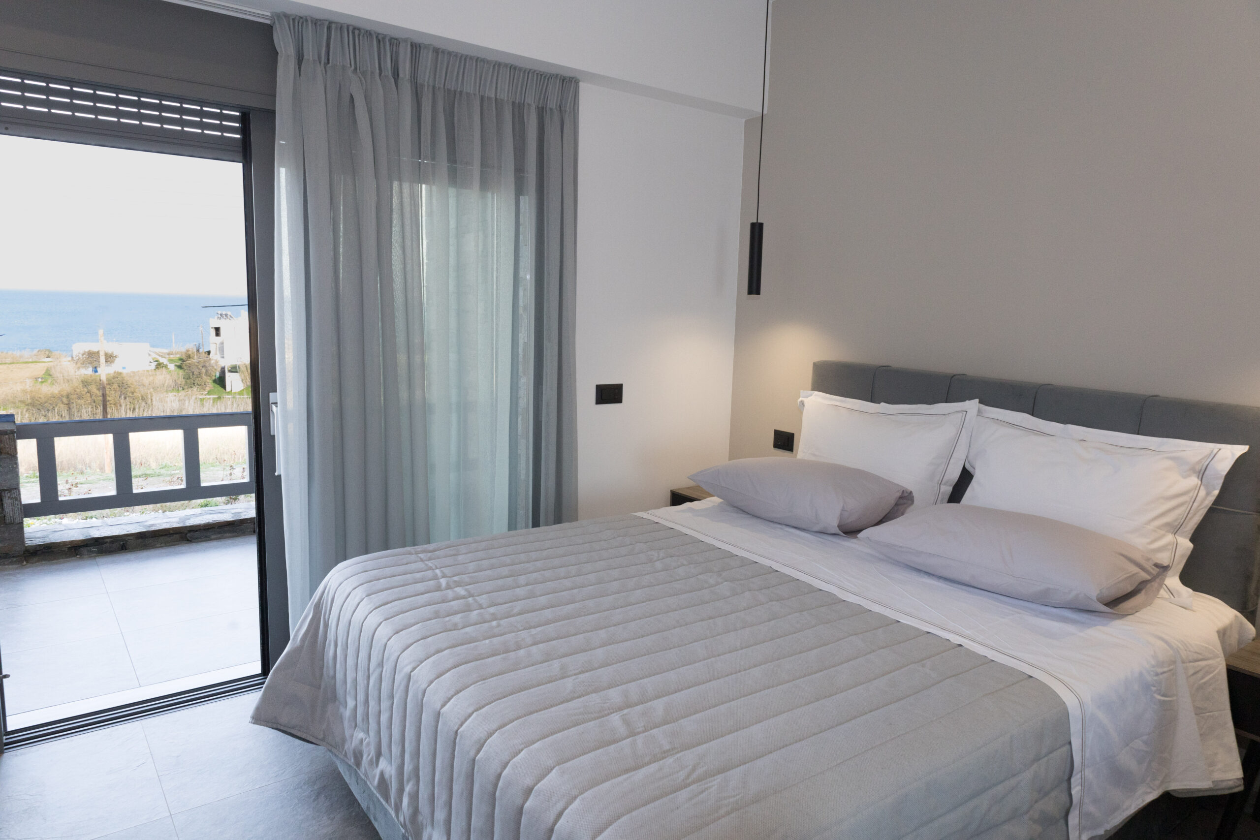 Each one of our suites consists of a comfortable space with modern and careful decoration and a breathtaking view of the Aegean Sea. Our space also has a beautiful garden and includes two barbecues (LPG, conventional).