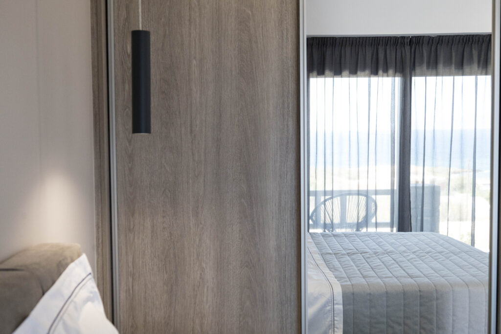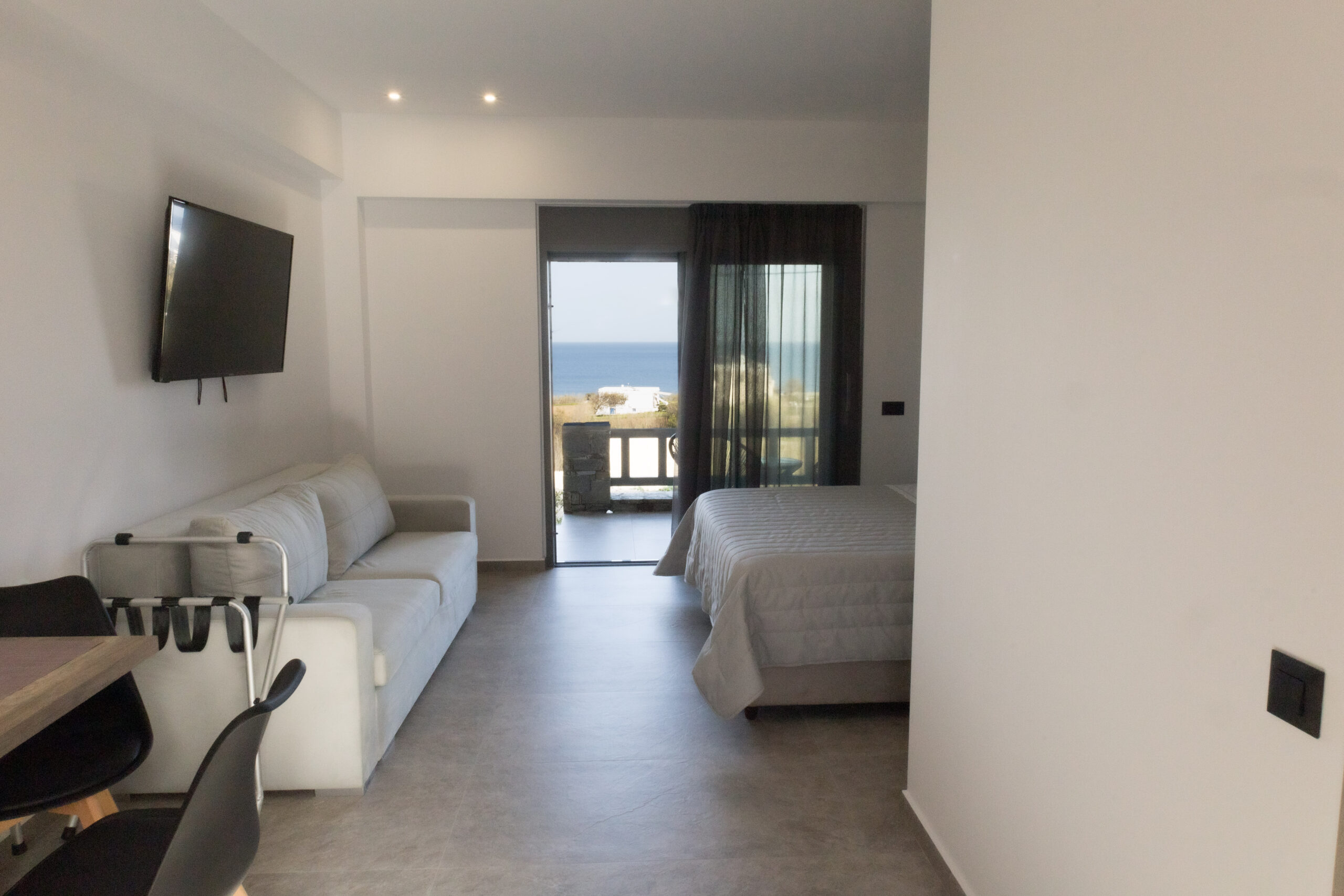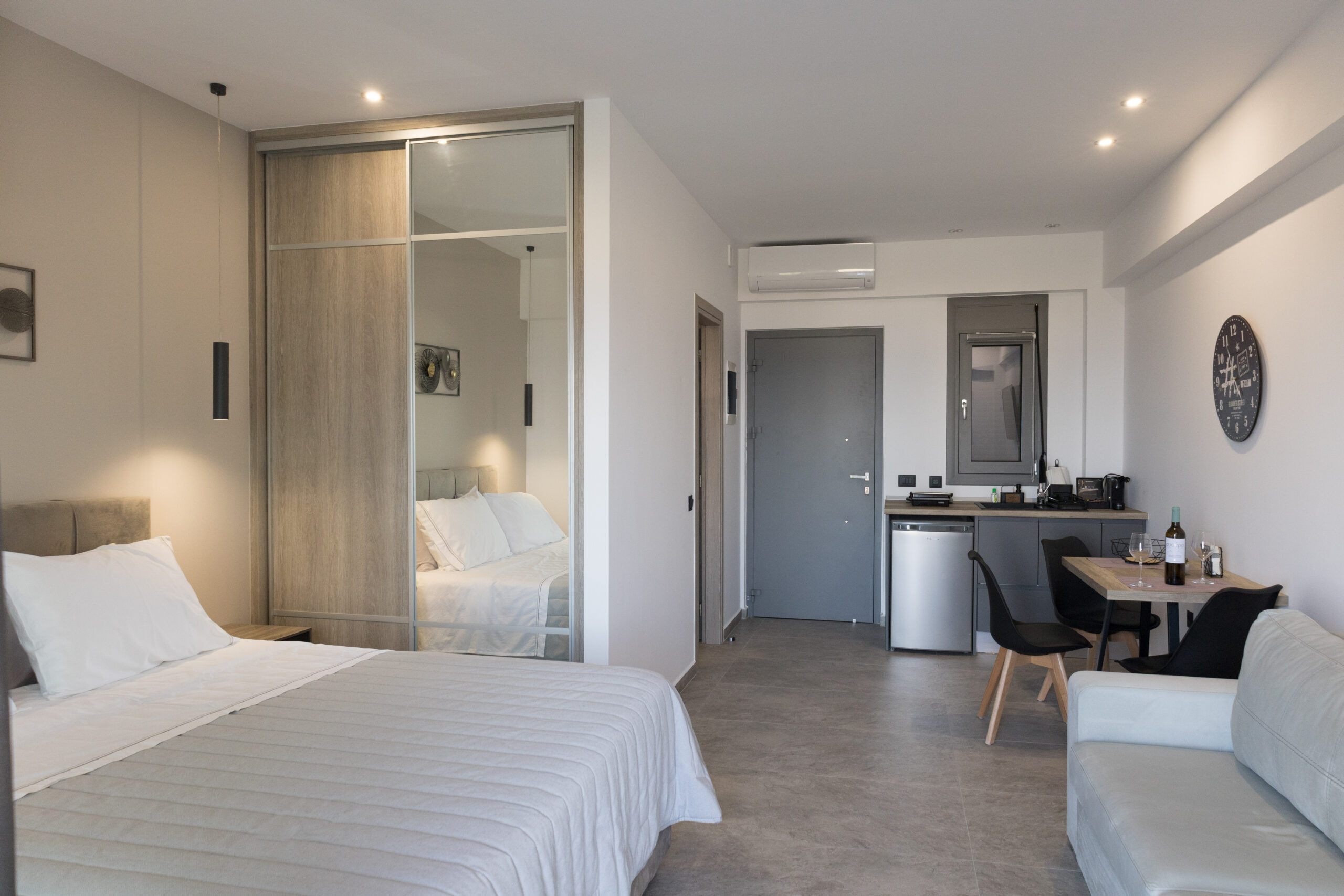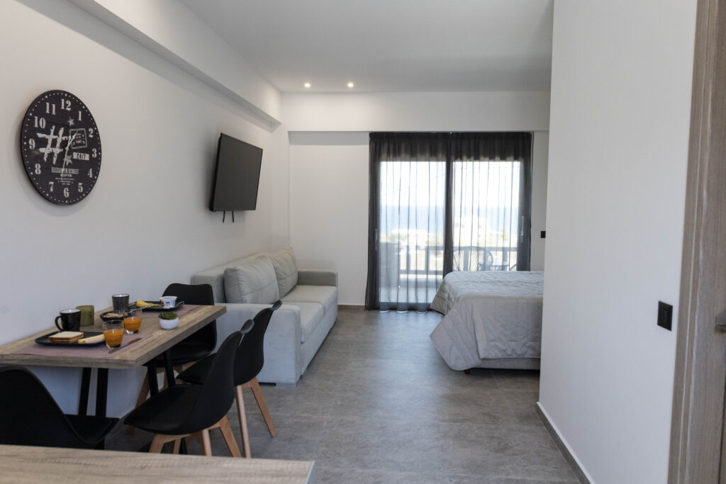 The junior suite consists of a large open plan area that includes a queen size bed, a smart tv, a spacious wardrobe, a sofa bed, a dining area, a kitchenette breakfast and a bathroom with a shower. It also provides two verandas, one on the east side and one on the west, where the guests can enjoy moments of peace with or without the sun. The number of people the suite can accommodate ranges from 2 to 3 adults or from 2 adults and 2 children up to the age of 10.