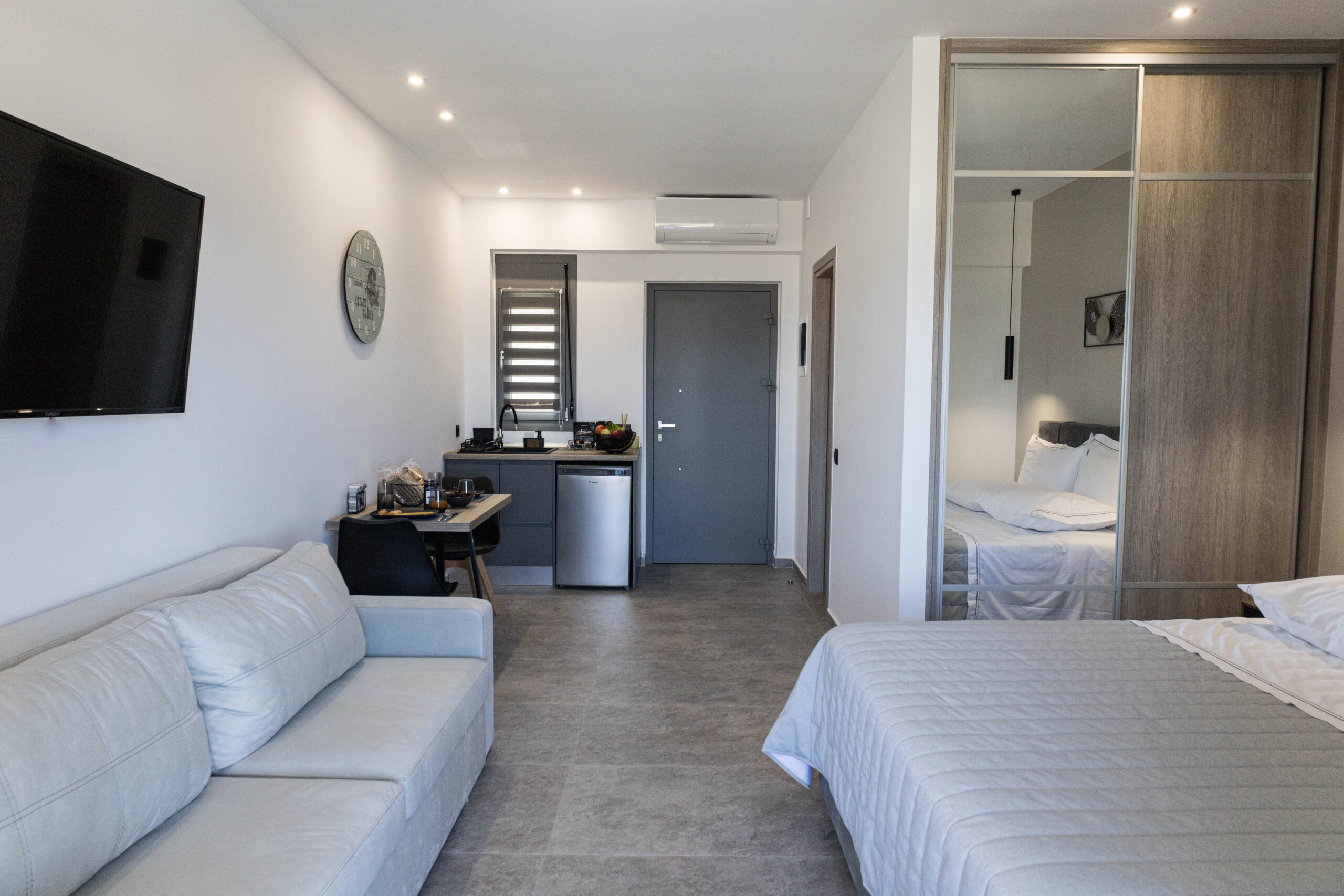 The junior suite consists of a large open plan area that includes a queen size bed, a smart tv, a spacious wardrobe, a sofa bed, a dining area, a kitchenette breakfast and a bathroom with a shower. It also provides two verandas, one on the east side and one on the west, where the guests can enjoy moments of peace with or without the sun. The number of people the suite can accommodate ranges from 2 to 3 adults or from 2 adults and 2 children up to the age of 10.